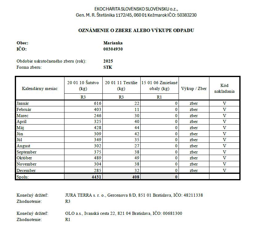 prinášame Vám ročnú štatistiku triedenia odpadov za rok 2025 v kategórii šatstvo a textil, ktoré boli vyzbierané prostredníctvom zberných kontajnerov v našej obci.